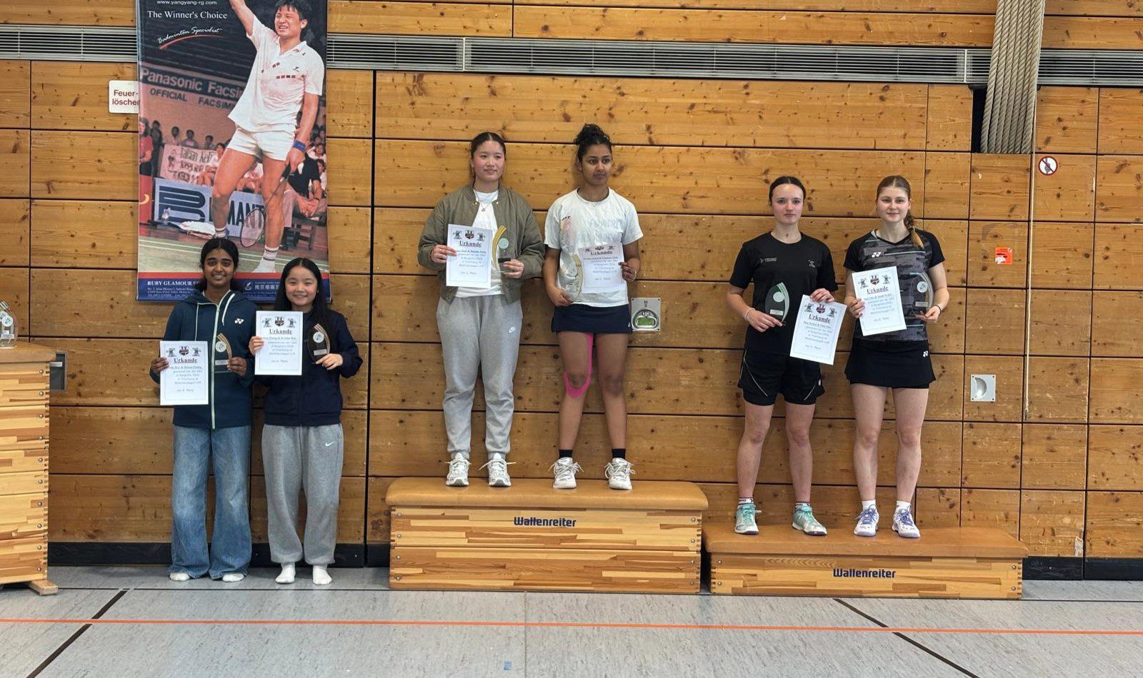 Helena Huang (U17) startete in allen drei Disziplinen bei U19 und schaffte es im Doppel (mit Krittika Roy, Schwanheim) mit Platz drei aufs Podest, im Einzel und im Mixed (mit Frederik Volkert, Hamburg) wurde sie jeweils Fünfte.