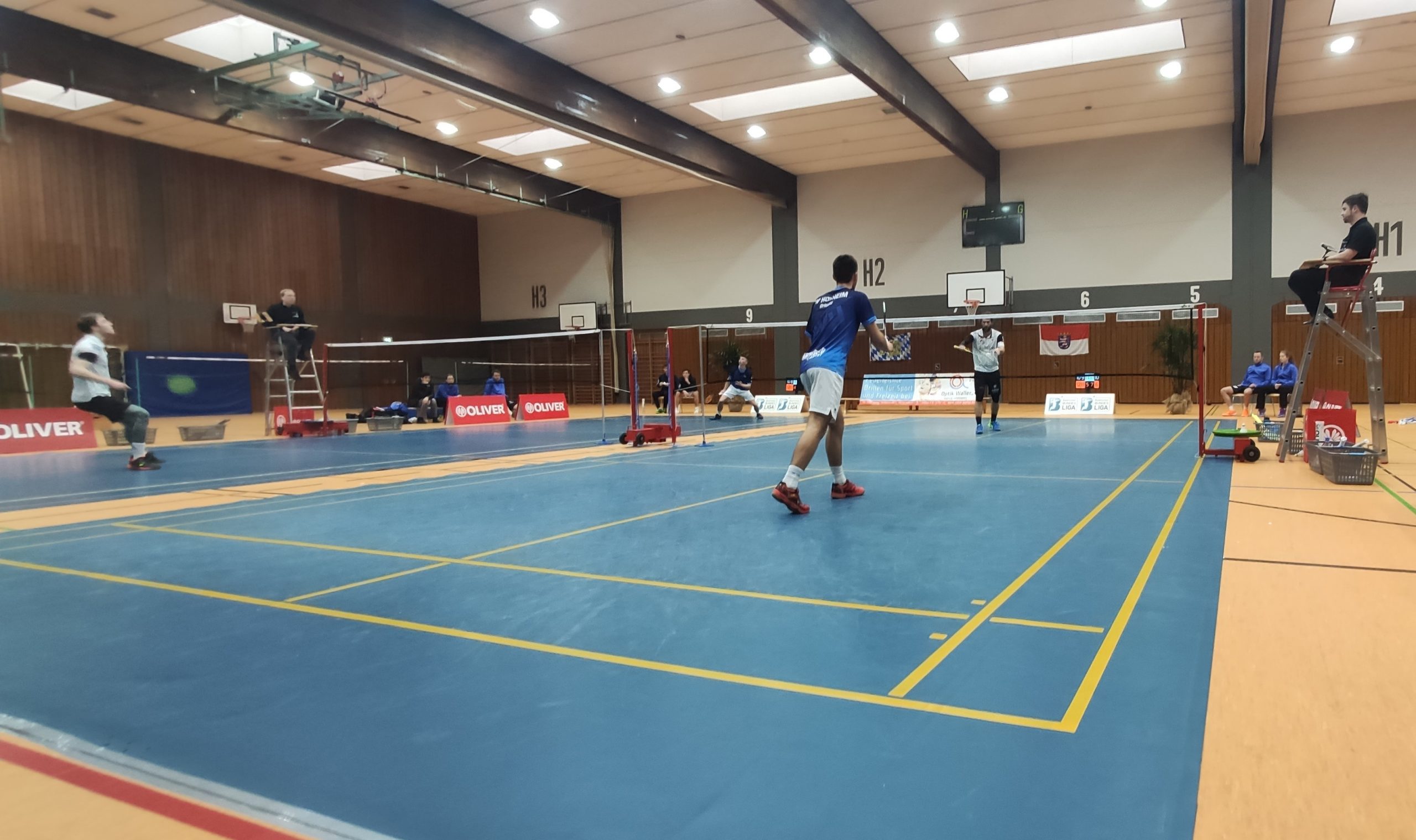 In einem hochklassigen 1. Herrendoppel konnten sich die Gebrüder Grieser in fünf Sätzen durchkämpfen und sicherten somit den ersten Punkt für den TVH. Gleichzeitig spielten Sandra und Mareike das Damendoppel, das ebenfalls auf fünf Sätze hinauslief. Hier mussten sich die Hofheimerinnen aber mit 9:11 im fünften Satz geschlagen geben, sodass der Zwischenstand 1:1 war. Schon nach zwei von sieben Spielen war die Stimmung in der Halle gewaltig und das Publikum feuerte die Spieler zu Höchstleistungen an. In den darauffolgenden Spielen, dem 2. Herrendoppel und dem Dameneinzel, musste sich der TVH leider ebenfalls geschlagen geben.